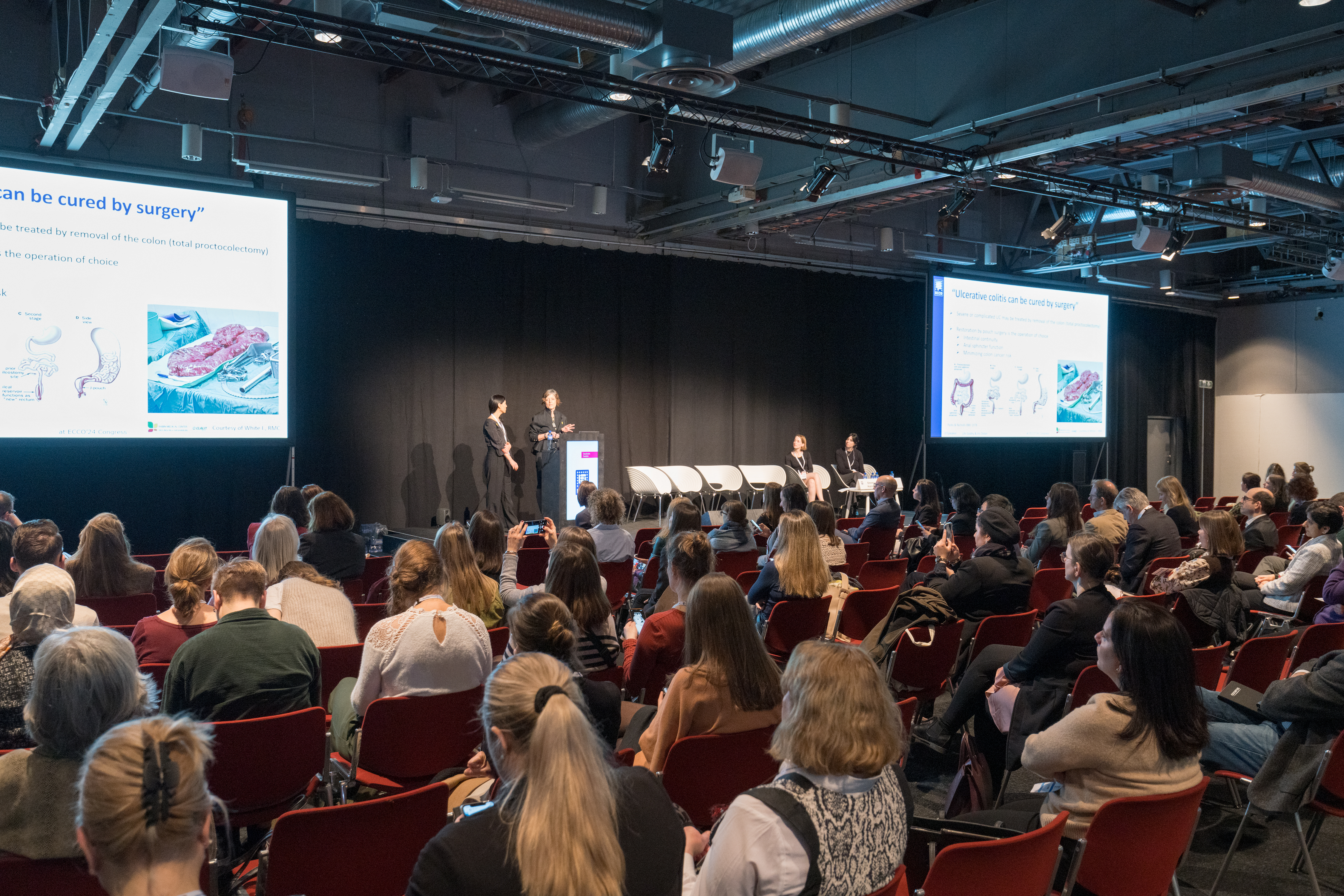 The final interactive session, which focused on surgical aspects, began with the second D-ECCO abstract presentation by Michiel Bak (The Netherlands). He indicated the importance of body composition assessment in preoperative patients with CD, pointing out that adverse findings on body composition measures are associated with postoperative complications and endoscopic recurrence. Following this, Julie Vanderstappen (Belgium) gave a talk on diet throughout the surgical pathway. She highlighted the significance of dietary interventions along this pathway which, among other benefits, have been demonstrated to decrease postoperative complications and enhance recovery. Next was an enriching tandem presentation by Iris Dotan (physician, Israel) and Lihi Godny (dietitian, Israel), who addressed pouch medical and dietetic management. Their focus was especially on the positive effect of the Mediterranean diet through microbiome modification and function [4]. This led to an engaging panel discussion in which Iris Dotan and Lihi Godny were joined by Julie Vanderstappen (dietitian, Belgium) and André D’Hoore (surgeon, Belgium), with each participant providing their input to foster dynamic audience interaction, emphasising the importance of a multidisciplinary team in managing complicated IBD patients.