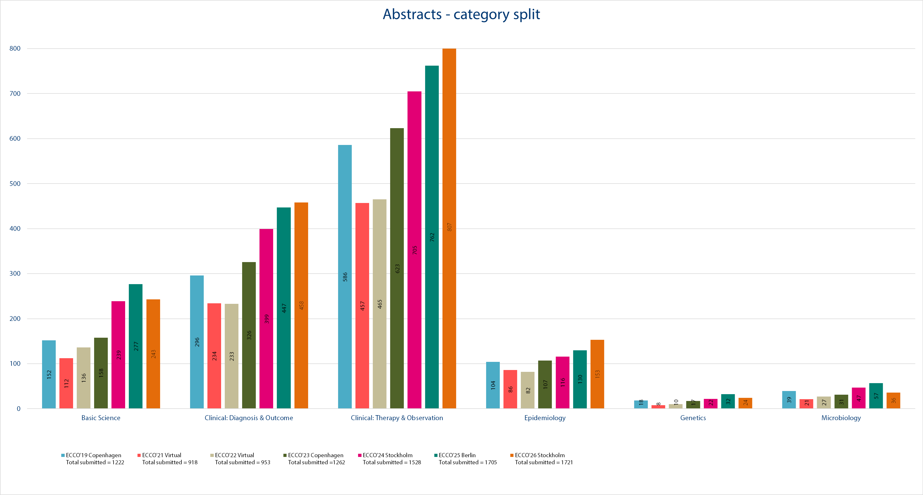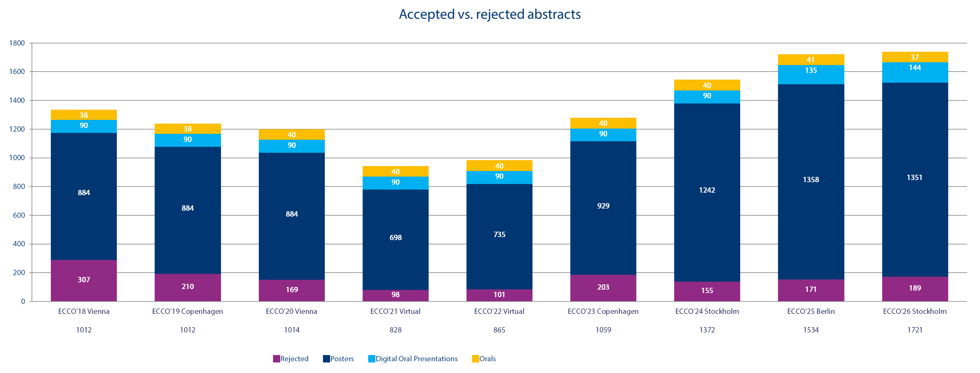A key component of the success of the ECCO Congress is the rising number of high-quality abstracts accepted for oral, digital oral and poster presentations. An outline of the evolution of abstract submissions is displayed here: