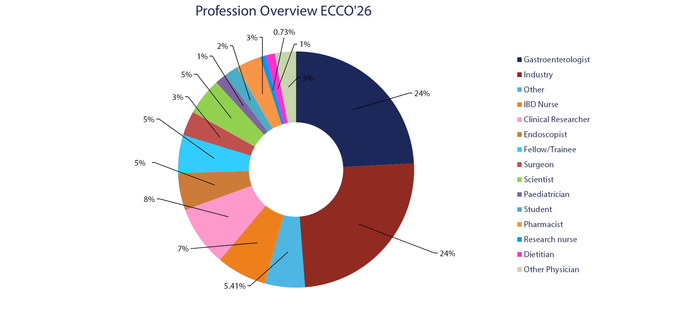 The pie chart below shows the distribution of professions among participants at the 21st Congress of ECCO. The largest groups were gastroenterologists and industry representatives, each making up 24% of attendees. Clinical researchers accounted for 8%, followed by IBD nurses at 7%. Endoscopists, fellows/trainees, and scientists each represented 5% of participants. Pharmacists, surgeons, and other physicians each contributed 3%, while paediatricians made up 1%. The remaining approximately 10% of delegates included students, dietitians, research nurses, radiologists and psychologists.